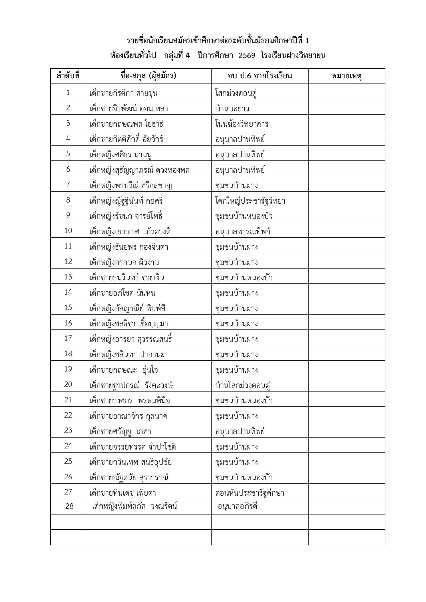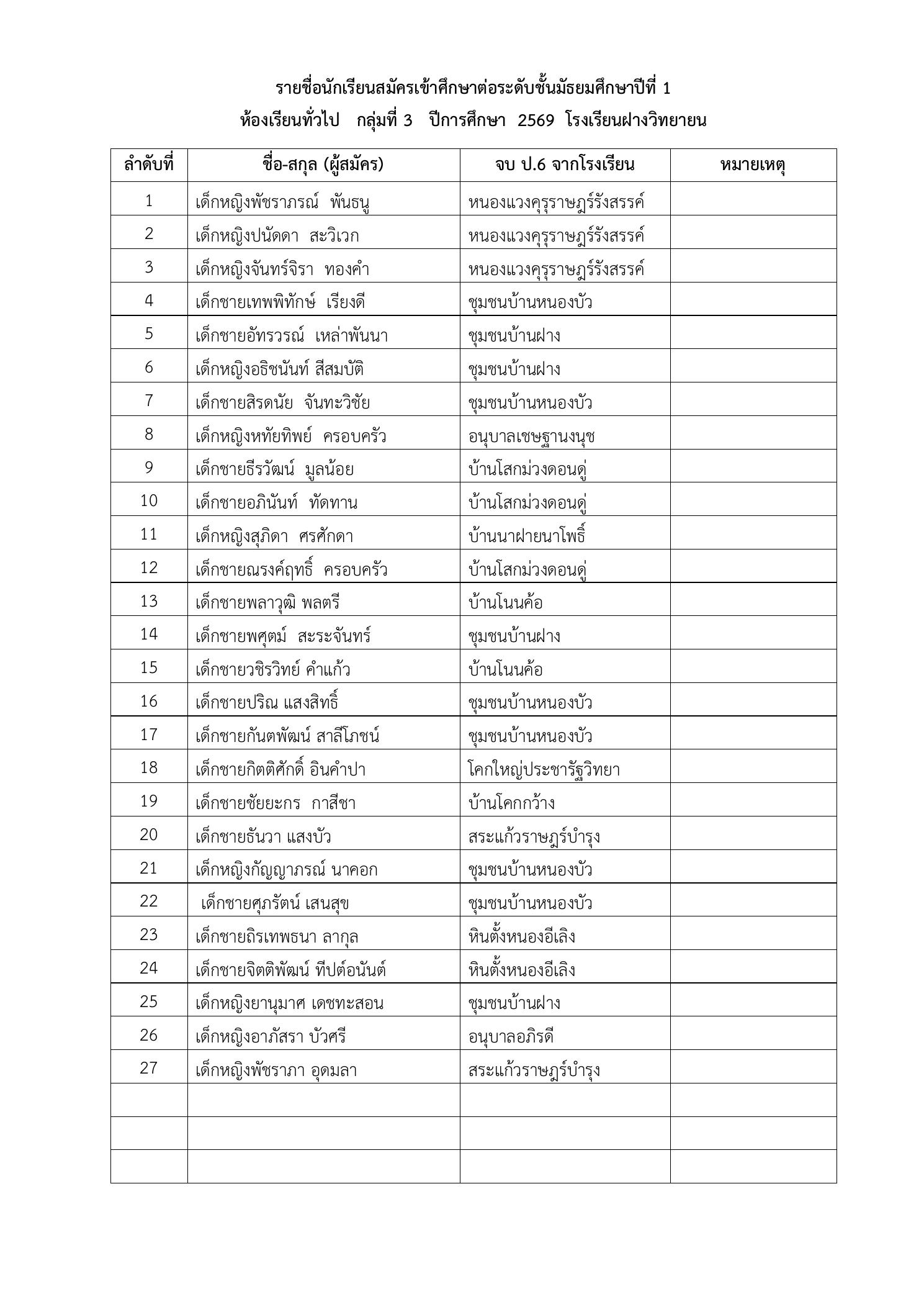 ประกาศโรงเรียนฝางวิทยายน เรื่อง รายชื่อผู้สมัครเข้าศึกษาต่อระดับชั้นมัธยมศึกษาปีที่ ๑ ปีการศึกษา ๒๕๖๙ เผยแพร่เมื่อ: 27 มีนาคม 2569 เขียนโดย Super User ฮิต: 42 หมวด: ประชาสัมพันธ์หนังสือราชการ